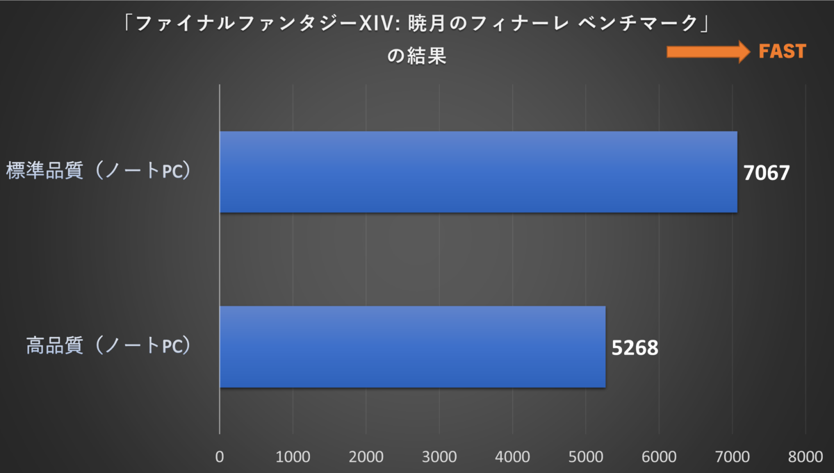 もう1つ、そこそこ軽い「ファイナルファンタジーXIV: 暁月のフィナーレ ベンチマーク」も実行してみた。グラフィック設定は、「高品質(ノートPC)」、「標準品質(ノートPC)」の2種類で、解像度はフルHDのフルスクリーン表示で計測している。
