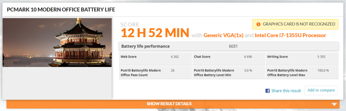 結果は、12時間52分と13時間近くバッテリーが持った。アプリを実行したときのバッテリーベンチなので、実際に使ったときに近い結果が得られるので、この結果は心強い。これなら1日外出しても電源アダプターを持ち歩く必要なないだろう。