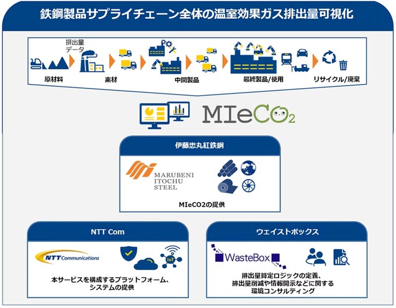 伊藤忠丸紅鉄鋼とNTTコミュニケーションズ(以下、NTT Com)、ウェイストボックスは8月30日、サプライチェーン全体の温室効果ガス排出量を算定・可視化・分析するクラウドサービス「MIeCO2(ミエコ)」を発表。9月1日より提供を開始する。