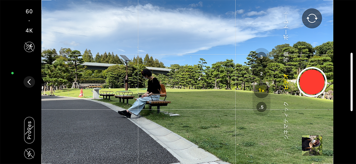グリッド線の基本的な使い方としては、水平方向のグリッド線(横線)に地平線や水平線を合わせる。そして、垂直方向のグリッド線(縦線)に人物や建物などの被写体を合わせつつ、グリッド線が交わるポイントに配置すると、バランスのいい安定感のある映像にできる、といった感じだ。