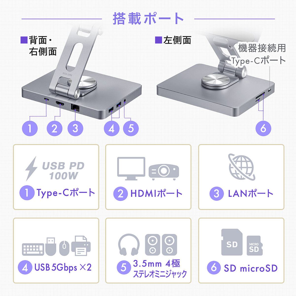 そのほか、USB 3.2 Type-A Gen1×1、SDカードスロット×1、microSDカードスロット×1、3.5mm 4極ミニジャック×1、USB Type-C×1を搭載。Type-CポートはUSB PD 100Wに対応しデバイスに給電しながらの使用も可能。