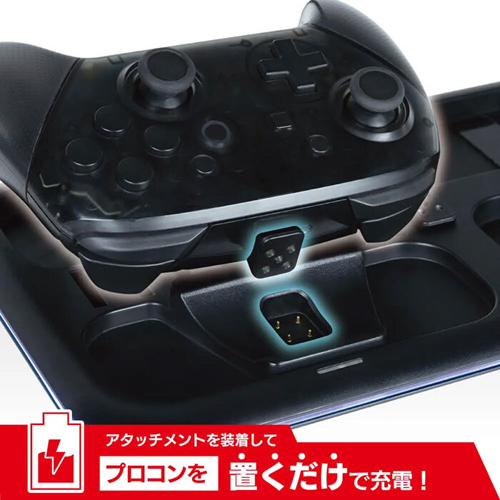ジョイコンを4本充電可能。さらに、プロコンにアタッチメントをつけることでプロコンを置くだけで充電可能です。また、LED点灯で充電状況を確認でき、充電中は赤く、充電完了時は青く点灯します。