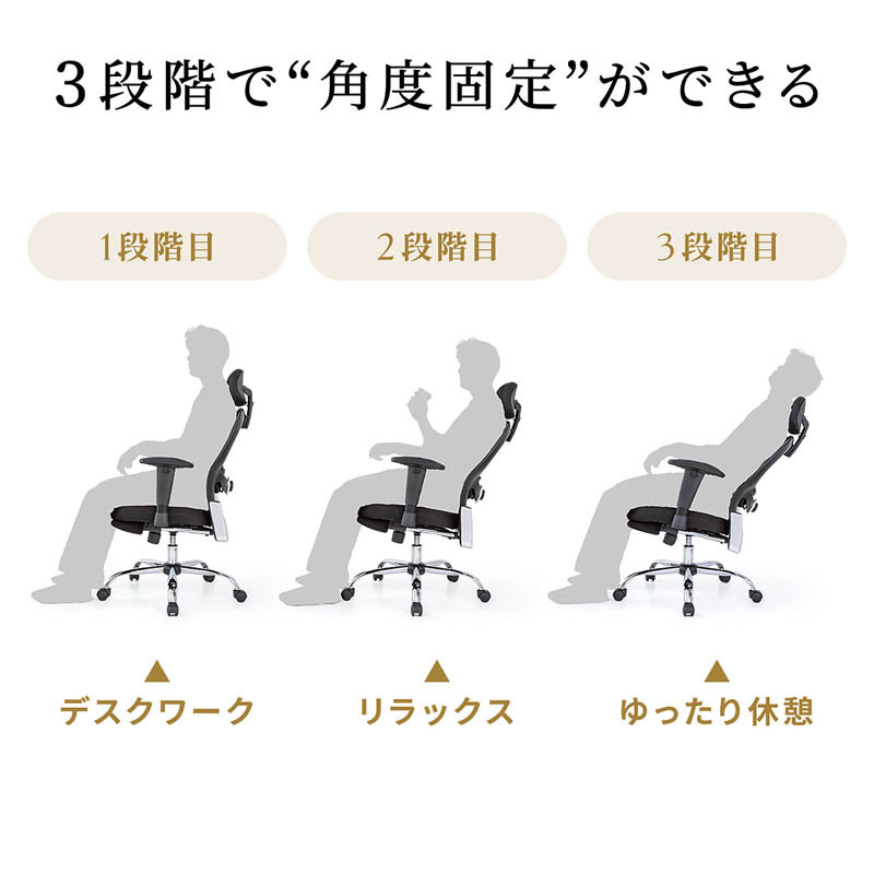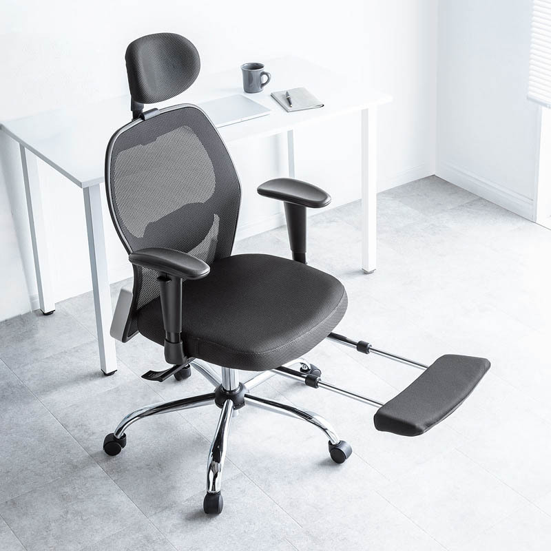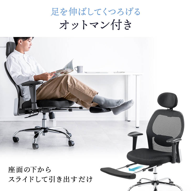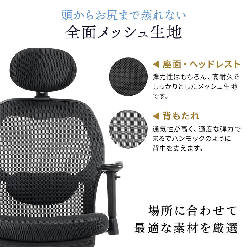 3段階で傾斜角度を変更できるロッキング固定機能や、背もたれを傾斜させたときに座面が連動して浮かび上がらないシンクロロッキング機能を備え、座面下にスライドして設置できる薄型オットマンを内蔵。背もたれはハイバックで全面メッシュ生地を採用するほか、上下調節可能なヘッドレスト、アームレスト、ランバーサポートを装備。