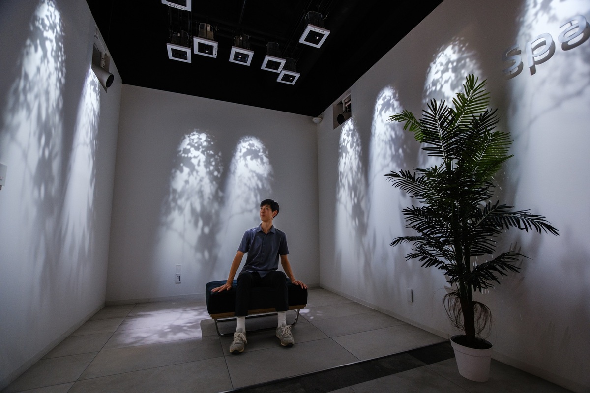 BSPラボでは、スポットライト型プロジェクター「スペースプレーヤー(Space Player)」も体験できます。見ごたえがあるのは鏡張りの空間。四方を滝や川に囲まれた、広大な森林のなかに入りこんだような感覚がありました。