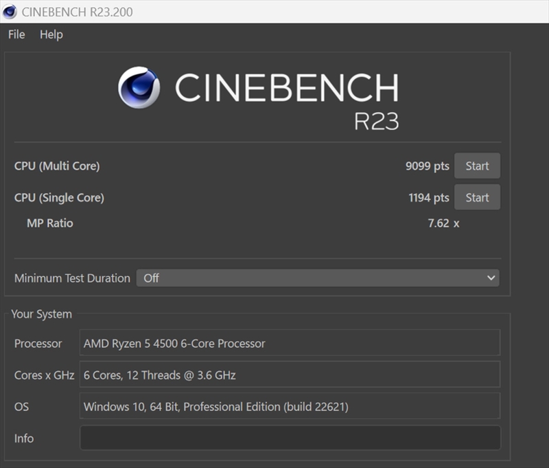 「CIENEBENCH R23」では、マルチスレッドテストのスコアーが9099cb、シングルスレッドテストのスコアーが1194cbと、近年の10スレッド超えCPUらしく比較的高い性能を発揮できている。「Ryzen 5 4500」自体は世代が古いCPUだが、ある程度ゲーム向けの性能を確保でき、コストパフォーマンスに優れることから選定されているのだろう。