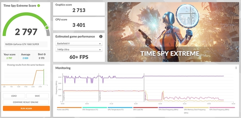 DirextX 12系のテストである「Time Spy」2種は、WQHD解像度でのテストとなる「Time Spy」のスコアーは6009とまずまず。一方で4K解像度のテスト「Time Spy Extreme」は、スコアー2797と振るわないものの、本製品のターゲットを考えれば当然ではある。「Time Spy」テスト中のフレームレートはおおよそ60fpsを下回っているものの、おおむね30fps以上は発揮できており、ある程度はWQHD解像度の高負荷なゲームプレイにも対応できることが分かる。