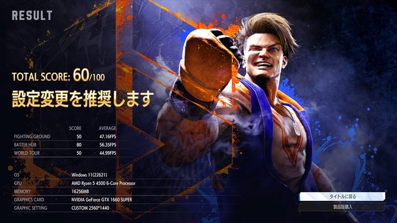 本ベンチマークでは通常の対戦環境を想定した「FIGHTING GROUND」のみ60fpsの制限がかかり、残り2モードは上限が120fpsとなっている。フルHD計測時の評価は最高点である100点で、「FIGHTING GROUND」はほぼ60fps張り付き、「BATTLE HUB」および「WORLD TOUR」では平均60fps越えの快適なフレームレートを達成できた。一方、WQHDではどのモードも平均60fpsを下回り設定変更が推奨されている。フルHDであれば画面のカクつきもなく快適にプレイできるため、大きな問題はないだろう。