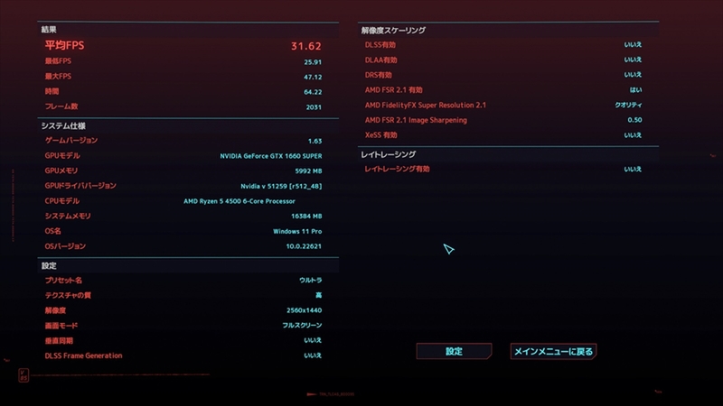重量級タイトルとして、「Cyberpunk 2077」の結果も計測してみた。こちらは画質プリセットを「ウルトラ」に設定し、解像度フルHD、WQHDの2パターンで結果を計測している。