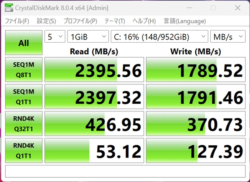 最後に、PCのストレージ性能をテストする定番ベンチマーク「CrystalDiskMark 8.0.4」の結果を見てみよう。読み込み・書き込みともにNVMe SSDとしてはそこまで速くないが、一般的なSATA SSDの速度は超えている。エントリー機のSSDとしては悪くなく、容量が1TBとしっかり確保されている点も評価できるポイントだろう。近年は1本でデータ容量100GBを超えるようなゲームも増えてきているが、Steamのクラウドセーブ機能なども組み合わせれば、そうそう容量不足に困ることはないだろう。