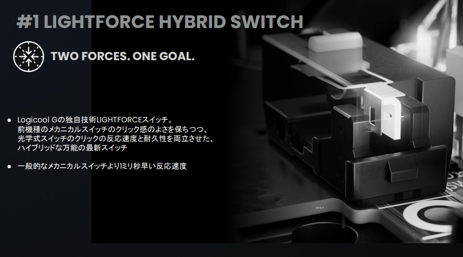 スイッチは、従来モデルではメカニカルスイッチを採用していたが、本製品ではメカニカルスイッチのクリック感はそのままに、光学式スイッチのクリックの反応速度も両立させた、ハイブリッドな「LIGHTFORCEスイッチ」を搭載している。これにより、耐久性も向上しているという。