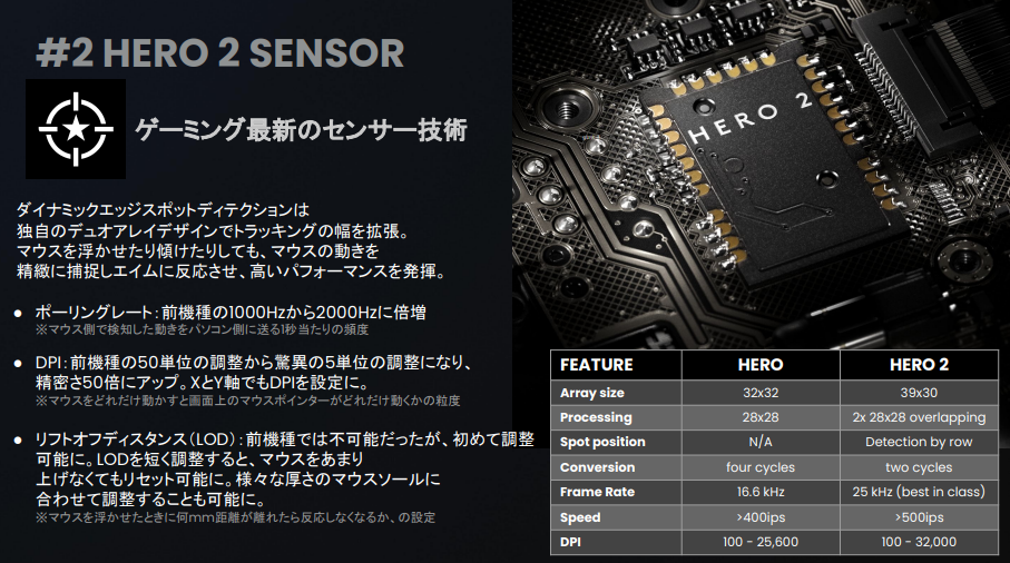加えて、新しく進化した同社独自の「HERO2センサー」を採用。ポーリングレートは前機種の倍となる2000Hzに向上したほか、DPIも前機種では50単位の調整だったが、本モデルは5単位の調整が可能となり、細密さも向上。さらに、同社のソフトウェア「Logicool G HUB」から、X軸とY軸の感度を別々に設定することも可能だ。