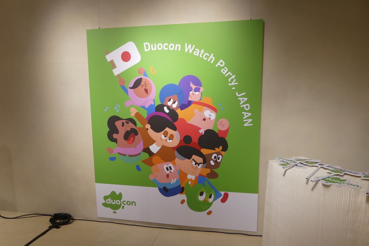 先日DuolingoのAI活用について書いたこともあり(関連記事:最良の教師を目指してきたDuolingoのAI活用 GPT-4で語学学習は新時代へ)、PR会社から「『Duocon Watch Party, JAPAN』というリアルイベントがあるので取材に来ませんか?」とお誘いを受けた。なにやらファンを集めて「Duocon 2023」という同社のグローバルイベントを視聴しつつ、Duolingo本社の開発担当に質問したり、ミニゲームでお互いに交流しようという内容。ファンとしては面白くないわけがないということで、一も二もなく参加することにした。