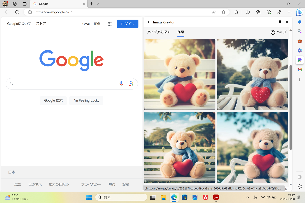 まずは「DALL・E2」で作成した時と同じプロンプトで試してみる。Edgeのサイドバーから「Image Creator」をクリックし、プロンプトに「熊のぬいぐるみ」を入力して「作成」をクリックする。以前はアップ気味にクマのぬいぐるみが生成されていたが、今回は全体が表示されるようになった。