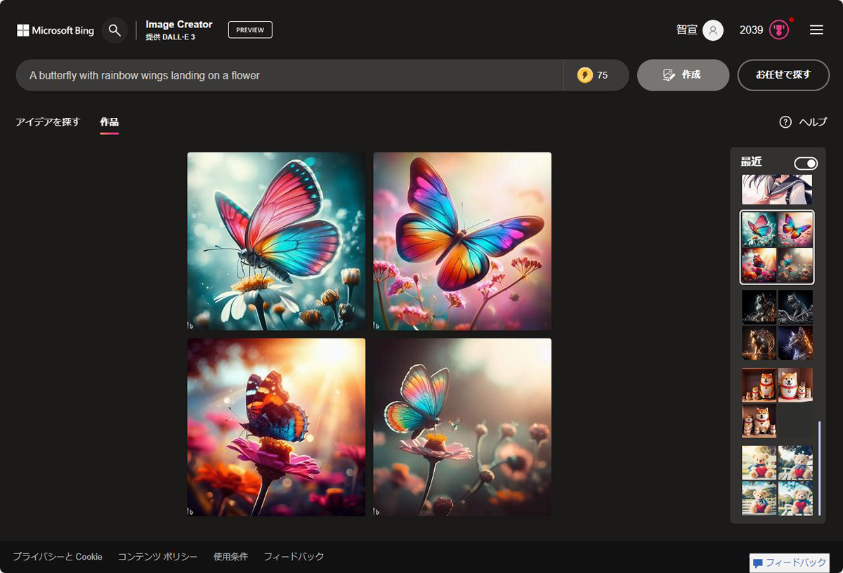総じて、DALL・E3の方が描写力が上がっている感じだ。「Image Creator」のウェブサイトでは、他のユーザーが作った作品を閲覧できるのだが、DALL・E2で作られた「A butterfly with rainbow wings landing on a flower」という画像を生成したところ、とても美しい画像が生成できた。