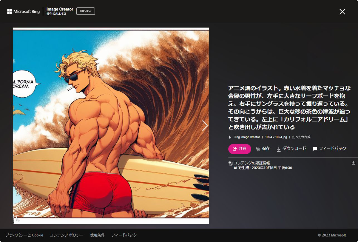 例えば、「アニメ調のイラスト。赤い水着を着たマッチョな金髪の男性が、左手に大きなサーフボードを抱え、右手にサングラスを持って振り返っている。その向こうからは、巨大な砂の茶色の津波が迫ってきている。左上に「カリフォルニアドリーム」と吹き出しが書かれている」といったプロンプトを入力すると、ある漫画の名シーンを再現させてみると、いい感じ。しかし、リアル描写にさせようとすると、NG。水着と言う言葉を削っても通らないので、何をどうしていいのかわからないのがつらい。