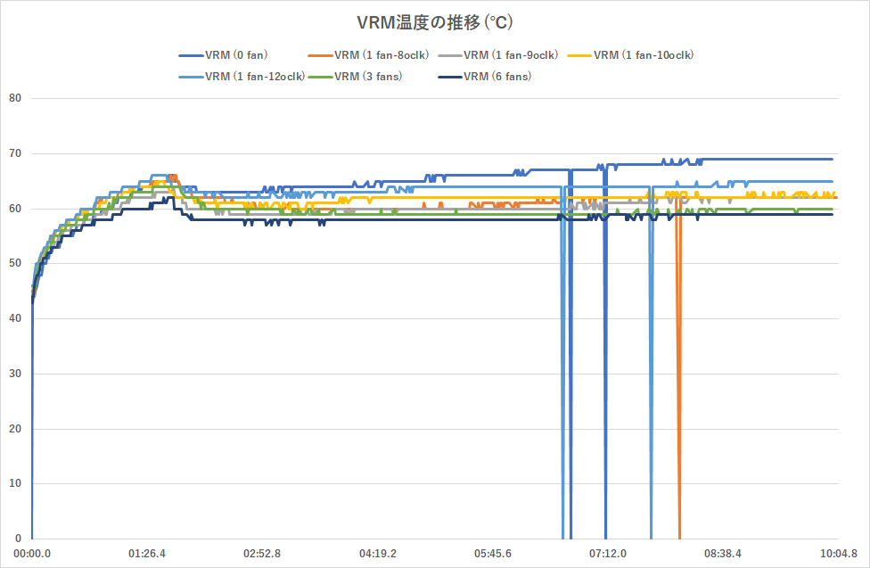 まず一番温度が高くなったのは当然のことながらファンが0基の場合で、最高で70度近くまで上昇した。だがファンを追加するとVRM温度は4~12度低下する。最もVRM温度が下がったのはVRMのあたりにまんべんなく風を当てられるファン3基とファン6基のパターンだが、ファン1基だけでも最大7度の温度低下が期待できる。