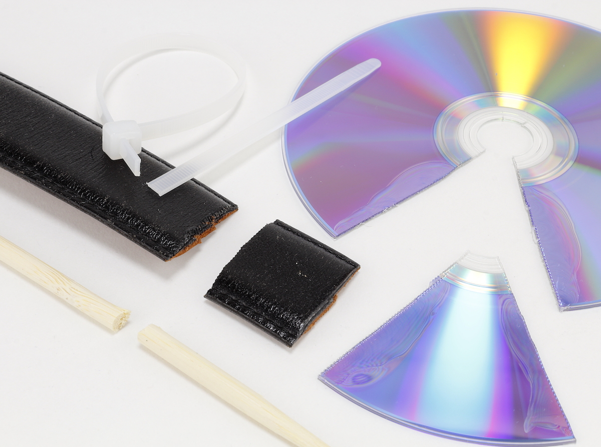 続いては、硬い、厚い、太い素材の例として、いくつか試してみました。切ってみたのは、革(ベルト)、竹箸(直径約5mm)、結束バンド、DVD-Rの4つです。これは力がいる素材となるため、奥のマイクロセレーション部で切りました。