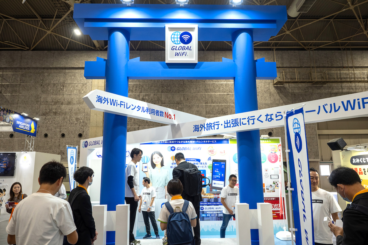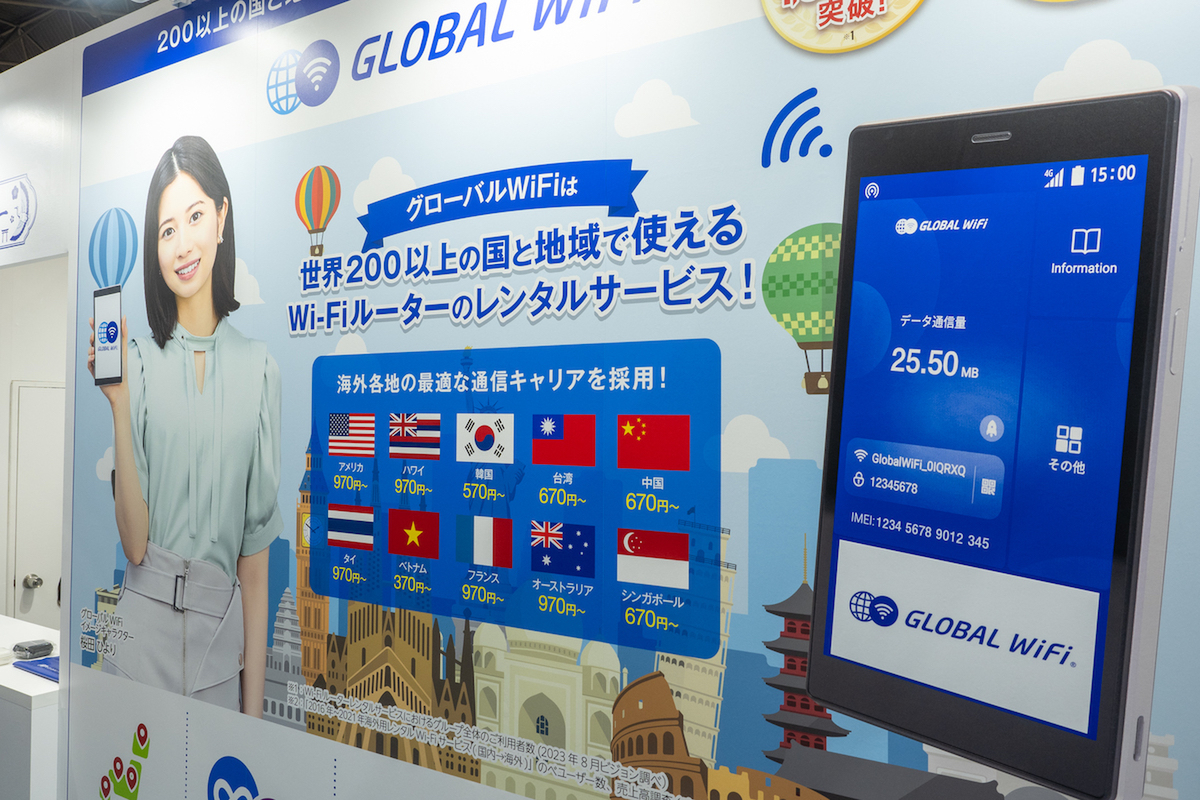 海外旅行向けのレンタルWi-FiルーターやeSIMといったサービスを提供している会社の出展は、激減。今年はビジョンが提供している「グローバルWiFi」の展示くらいで、その他はほぼ見かけませんでした。