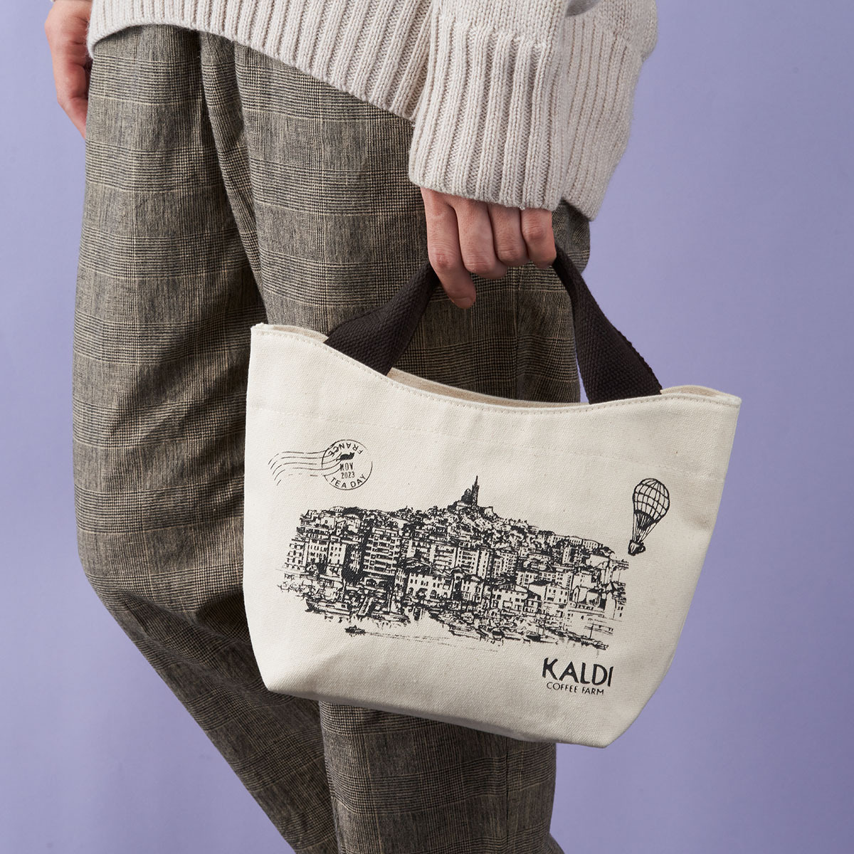 毎回人気の、カルディのオリジナルバッグの新商品。フレーバーティー2種をはじめ、お菓子、砂時計がキャンバス生地のトートバッグとセットになって1650円。