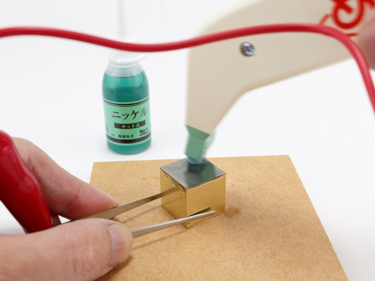 金メッキをする場合でも、下地にニッケルメッキをしておくと剥がれにくくなるとの事なので、まずはニッケルメッキから。金属を洗浄水から取り出し、筆先をゆっくり動かしながらメッキしていきます。