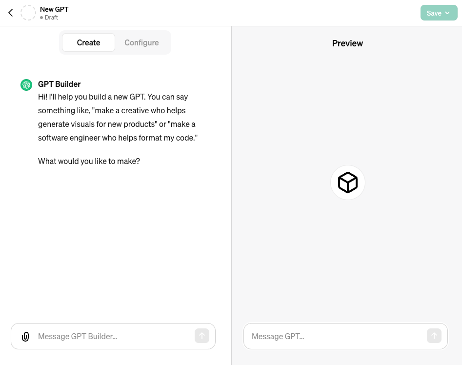 すると「GPT Builder」と呼ばれる画面が表示される。画面は左右に分割されており、左側にチャットウインドウ、右側にプレビューウィンドウという構成になっている。