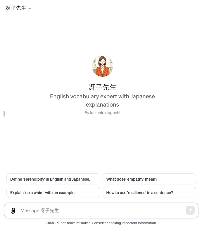 英語学習をサポートするマイオリジナルGPTの「冴子先生」がすでに爆誕しているではないか。質問例まで用意されている。ここまでわずか5分である。