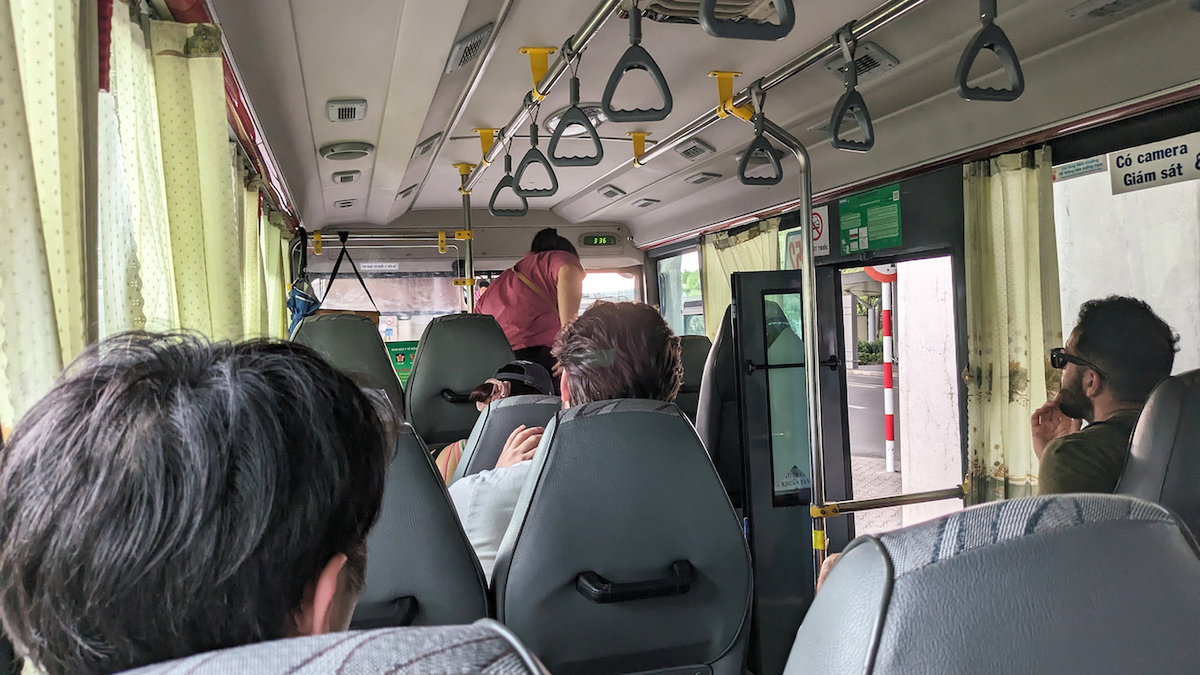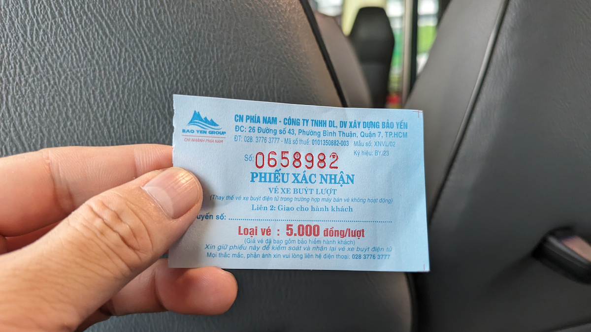 街の中心部へは「152」と書かれたバスに乗り込みます。運賃は5000ドンなので日本円だと約30円。地元の路線バスを使うとかなり節約できるのでありがたいです。ちなみに料金は5000ドンですが、大きな荷物がある場合は別途追加料金がかかります。自分は膝の上に載せられるサイズのバックパックだったので不要でした。