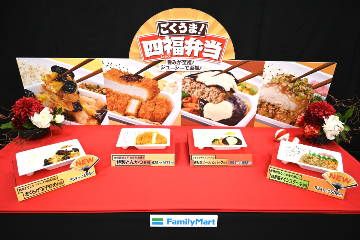 ファミリーマートでは、2022年2月より「肉弁当四天王」と題して、とんかつ弁当、ハンバーグ弁当を始めとした4商品を展開してきました。この度、商品ラインナップやテーマを見直し、リスタートする形で「ごくうま!四福弁当」が誕生しました。