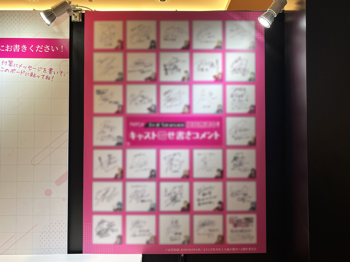 会場前にはTVアニメで各キャラクターを演じる声優さんたちのサインと寄せ書きコメントがあります。声優さんたちがそれぞれのキャラクターに合ったコメントで現在放送中のTVアニメ3期を盛り上げています。ぜひ入場前に見てみてください!