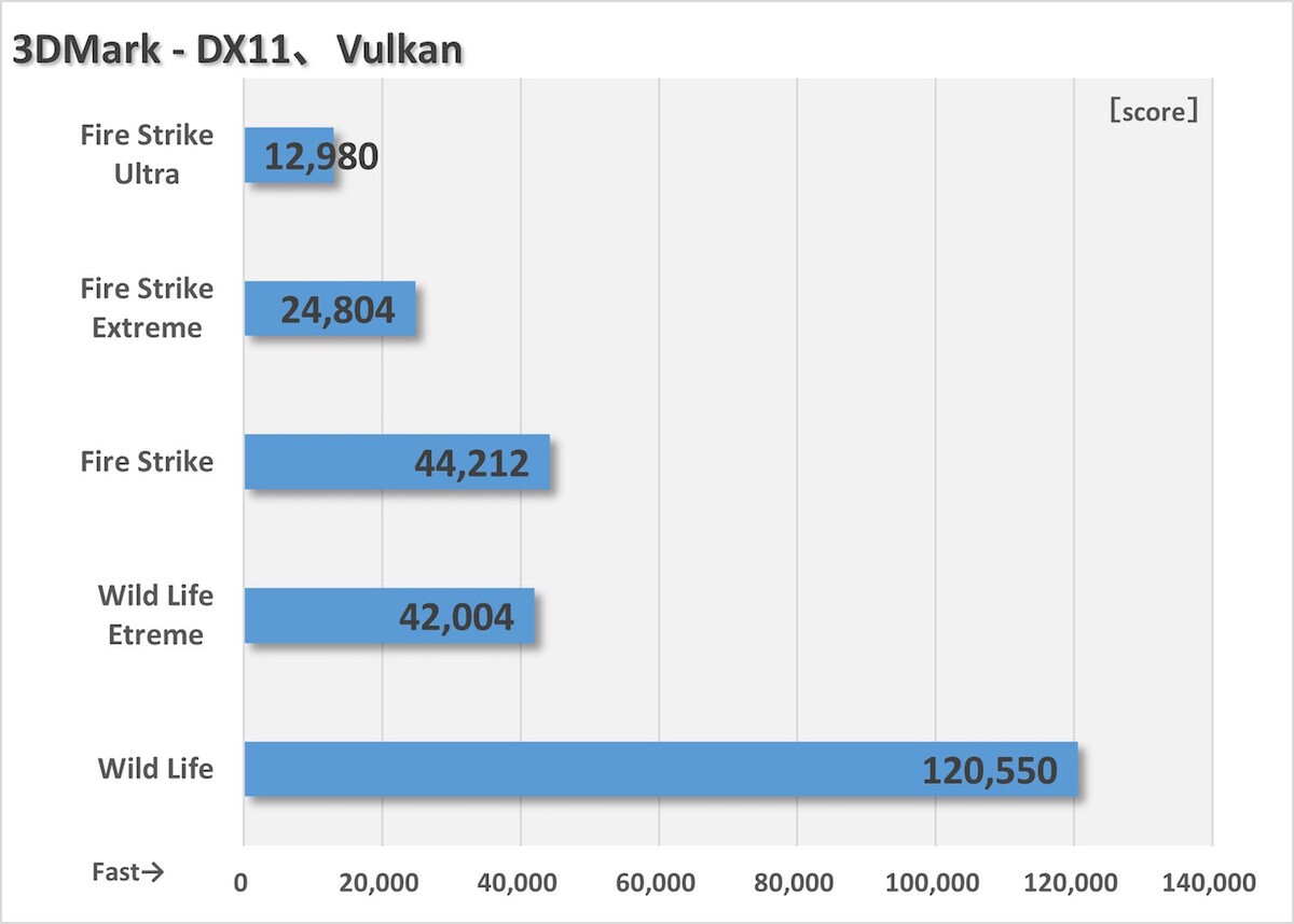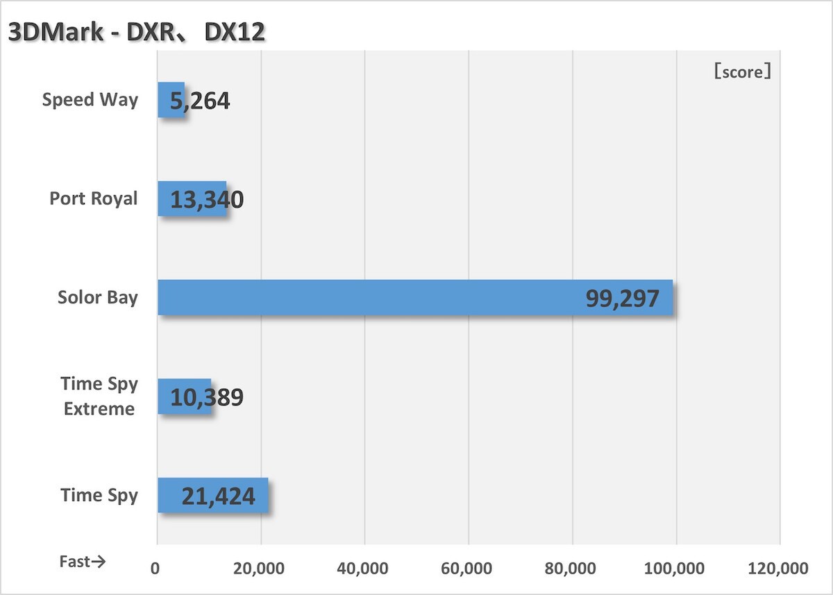 3DMarkのスコアは4K、レイトレーシングのSpeed Wayこそ5264ポイントにとどまるも、Port Royalで13340ポイントと十分。DirectX 12や11の4K、Time Spy ExtremeやFire Strike Ultraは10000ポイントを超えている。全体的に、4Kプレイが十分に狙えるパフォーマンスで、一部のGPU負荷が重いタイトルについては画質設定を引き下げたり、WQHDに引き下げたりといった対応でプレイできるだろうと予想される。