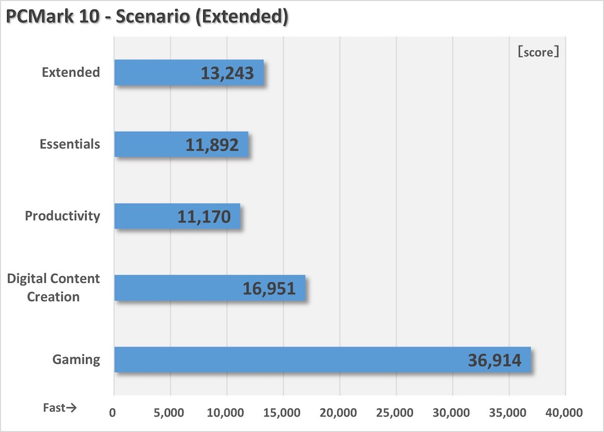 PCMark 10 ExtendedのスコアはEssentials、Productivity、Digital Content Creationがそれぞれ10000ポイントを超えているように高性能なPCであることがわかる。Gamingは36914ポイントという高得点だ。