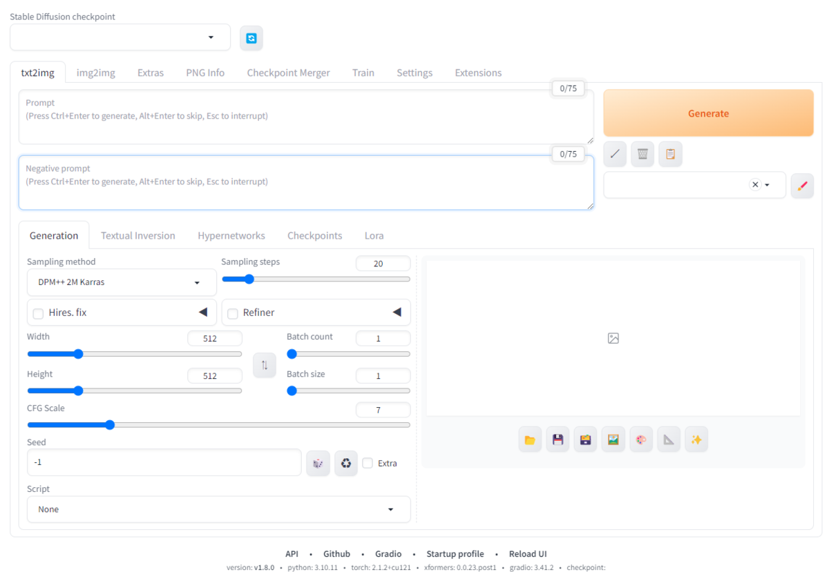 自動的にブラウザーが起動し「Stable Diffusion WebUI(AUTOMATIC1111版)」の画面が表示された。