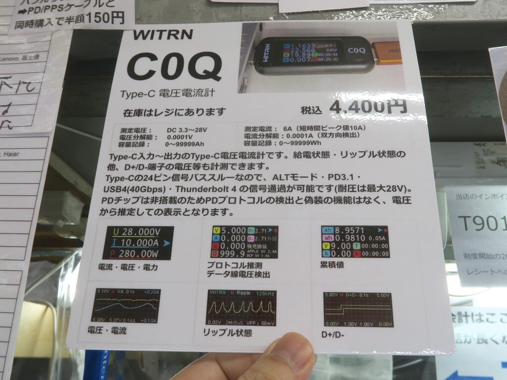 USB Type-C機器の電流・電圧その他の情報を手軽にチェックできる電圧電流計「C0Q」がShigezoneにて販売中。WITRNブランドの製品で、価格は4400円だ。