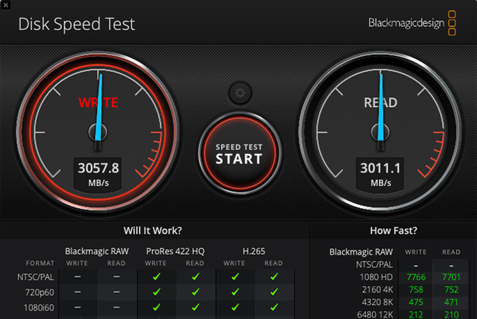 続いてmacOS Ventura 13.6.6のM2 Pro Mac mini(2023)で、両ベンチマークを実行すると、「AmorphousDiskMark 4.0.1」のライトパフォーマンスは、しっかりと伸び、PCIe4.0×4モデルは3000MB/秒台を記録した。「Blackmagic Disk Speed Test」でも安定したリード・ライトパフォーマンスを発揮したので、不安なく使えるだろう。