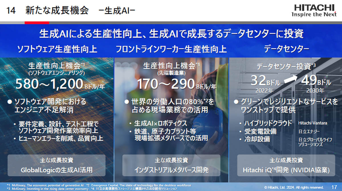 その一方で、データセンター需要の急拡大においては、日立エンジーの受変電設備、日立グローバルライフソリューションズの冷却設備などによるオファリングを強化する考えであり、「データセンター向けに、グリーンでレジリエントなサービスを、ワンストップで提供する。ここにも投資をしていく」とした。