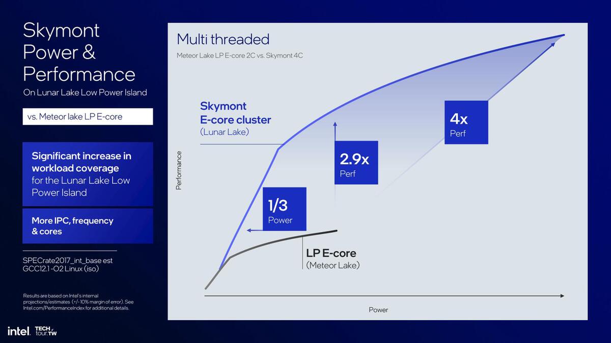 これはつまり、Pコアを低消費電力で稼動させるくらいなら、Skymontに置き換えた方が効率がいいということである。ただ逆にターボブーストなどは効きにくい(消費電力を増やしても性能はほとんど上がらない)ことでもあって、デスクトップには微妙な感じ。このあたりがPコアの代替にはならない理由でもある