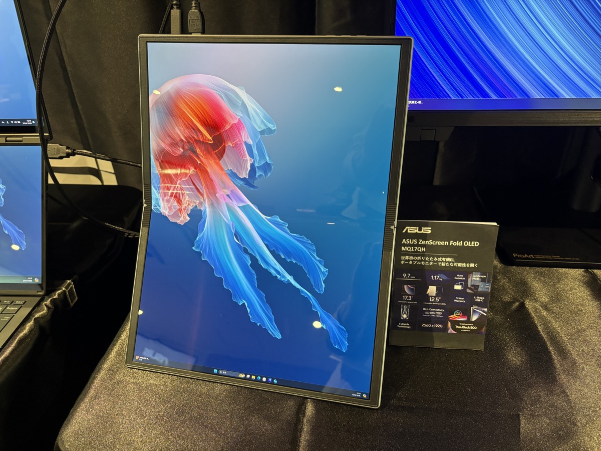 会場で注目を集めていたのは、国内未発表の17型折りたたみ有機ELディスプレー「ASUS ZenScreen Fold OLED MQ17QH」。解像度は2560×1920ドットで重量は1.17kg。USB-C×2とミニHDMI、イヤホン端子を搭載し、折りたたむと12.5型相当とコンパクトに持ち運べる。年内の国内発売を目指しており、想定価格は30万円前後とのこと。