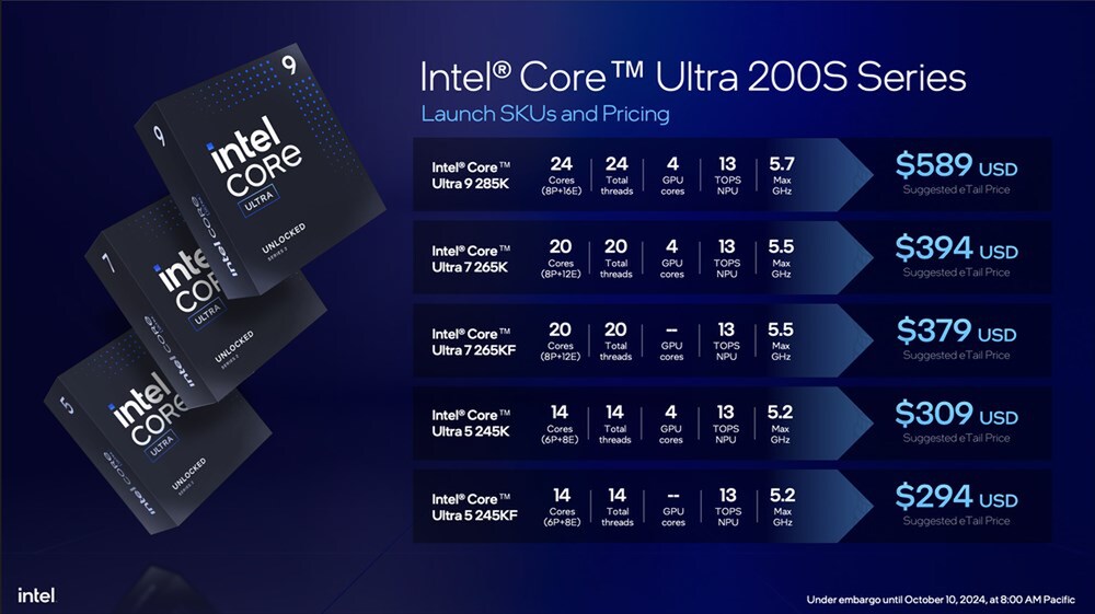 Core Ultra 200Sシリーズの第一弾は内蔵GPUを搭載した「Core Ultra 9 285K」「Core Ultra 7 265K」「Core Ultra 5 245K」の3モデル、さらに内蔵GPUを持たない「Core Ultra 7 265KF」「Core Ultra 5 245KF」の2モデル、合計で5モデルが出荷される。