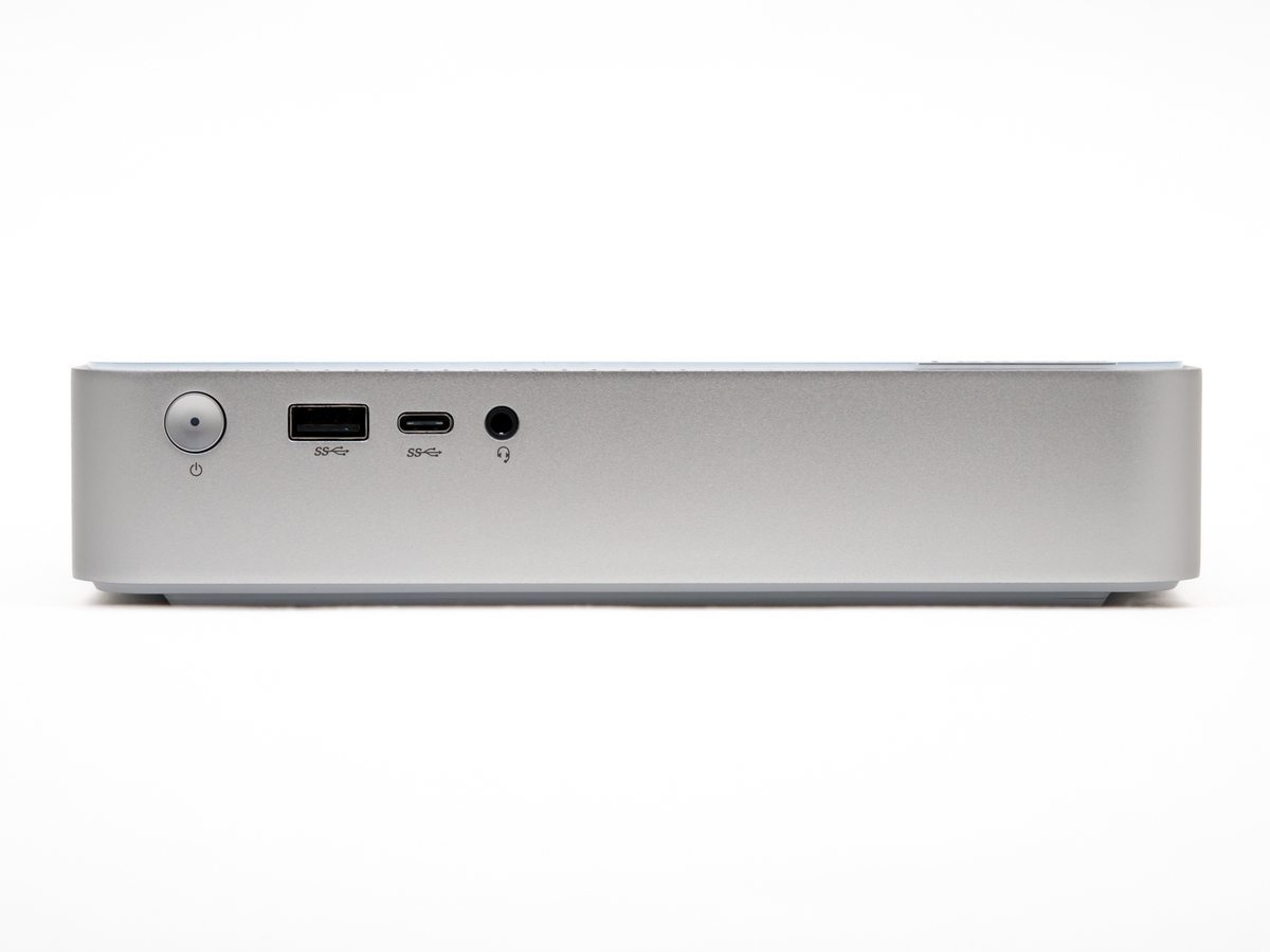 「IdeaCentre Mini Gen 8」を使い始めてまず感じた魅力が、コンパクトな筐体にもかかわらず充実したインターフェースが搭載されている点だ。本体前面には電源ボタンとUSB 3.2 Gen2 Type-A、USB 3.2 Gen2 Type-C、マイク入力/ヘッドホン出力コンボ端子があり、本体背面にはLAN、USB 3.2 Gen2 Type-A×2、USB 2.0、Thunderbolt 4、HDMI 2.1、DisplayPort 1.4b端子が搭載されている。