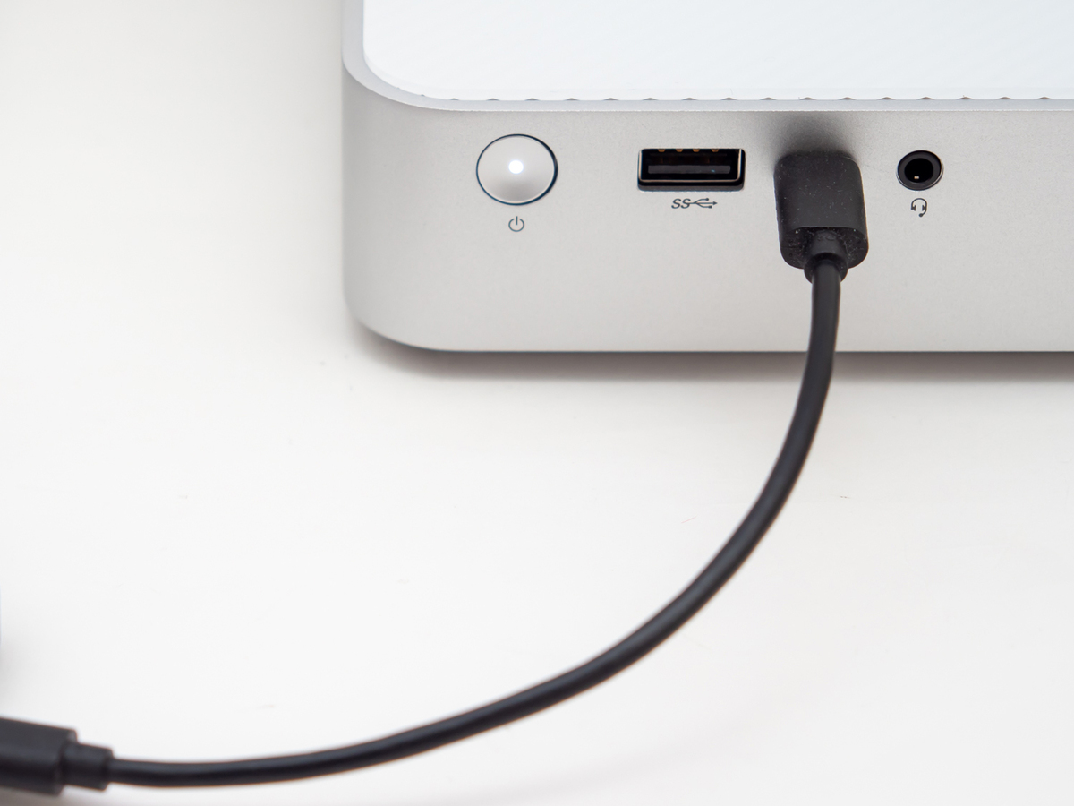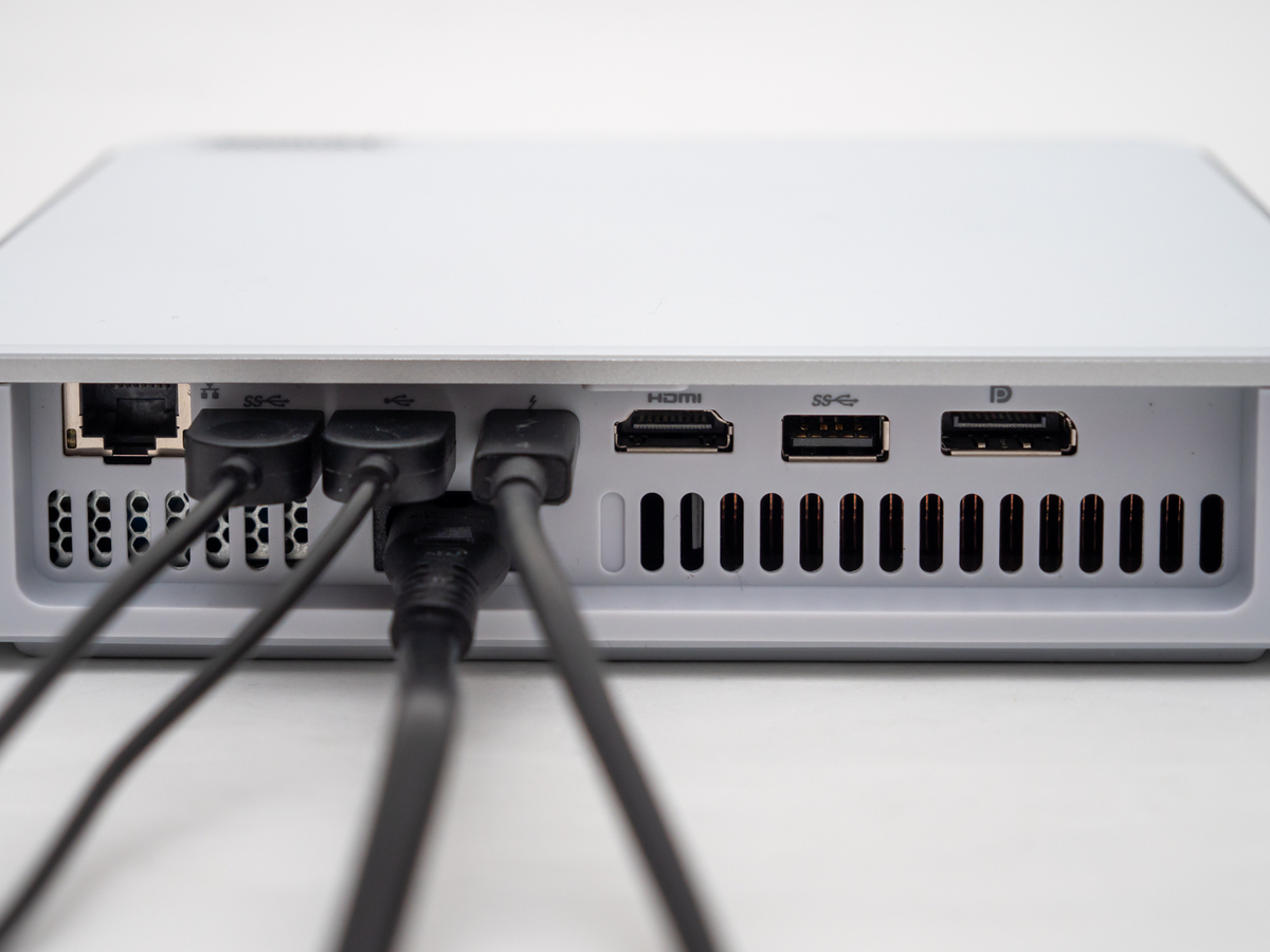 また、背面の各端子は一定の間隔を空けて横一列に並べられているため、コネクター部分が大きなケーブルでも干渉しにくいうえに、抜き差しするときも間違えにくい。実は、初めて小型パソコンを買う人に気を付けてほしい点が、端子同士の間隔だ。一般的な小型パソコンの中には、サイズを小さくするため端子同士の間隔が狭くケーブルを抜き差ししにくいものがあるため、ケーブルを抜き差しする度にパソコンの背面が見えるように取り出すハメになりかねない。「IdeaCentre Mini Gen 8」はそんな苦労をしなくて済むよう配慮されているのだ。