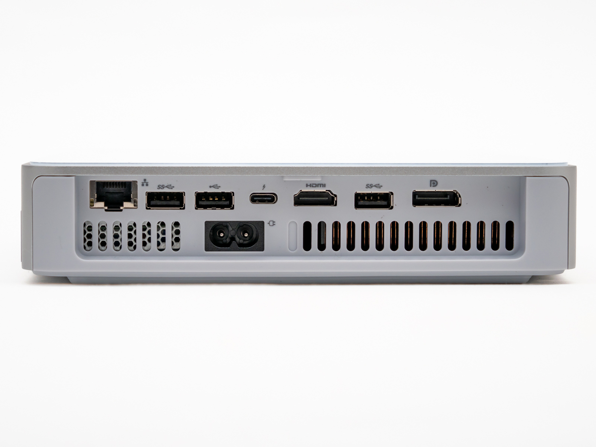 「IdeaCentre Mini Gen 8」の背面は、Thunderbolt 4やUSB3.2 Gen2などの転送速度が高速な端子が複数用意されている。外付けSSDをつないでストレージ容量を拡張したり、大切なデータをバックアップしたりするのも簡単に実現できる。