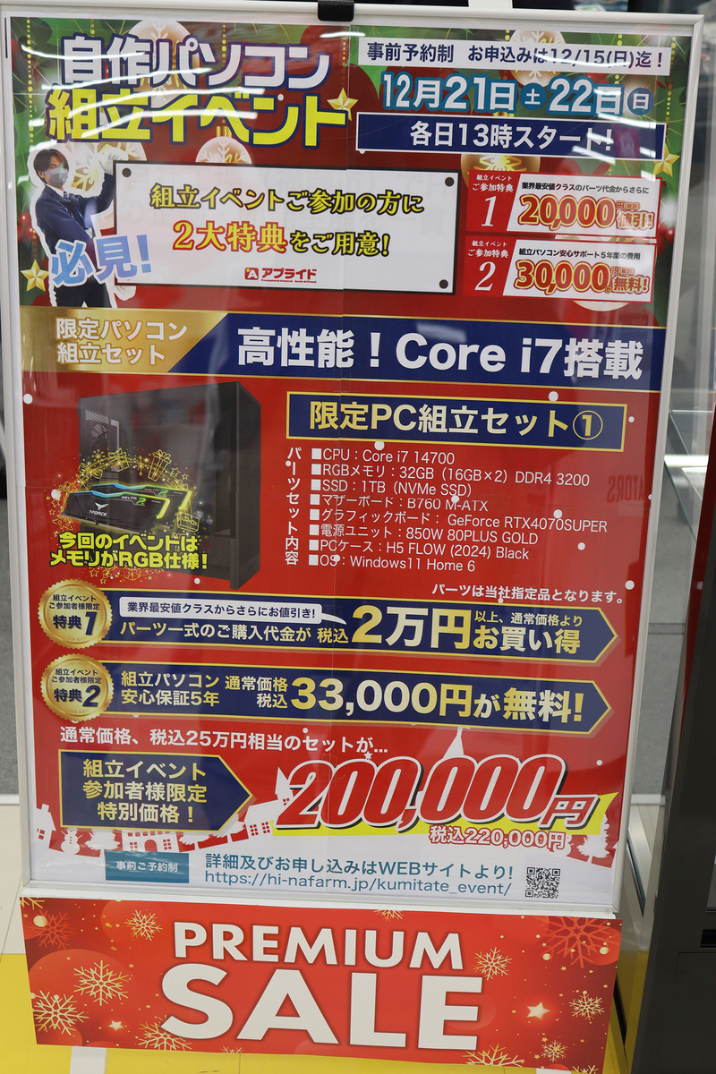 詳しい構成はイベントサイトで確認できますが、価格は業界最安値クラス。そして、イベント参加特典として通常価格より2万円引きの特別セットを購入でき、組立パソコン安心保証5年間の費用(税込3万3000円)が無料となる特典が付いています。なので、「次回こそは!」と考えている人はぜひチェックしてみてください。