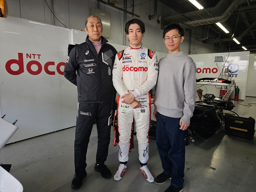 左からDOCOMO TEAM DANDELION RACING 代表 村岡 潔氏、ドライバーの牧野任祐選手、NTTドコモ ブランドコミュニケーション部 コーポレートブランド コーポレートブランド担当主査の島﨑大介氏