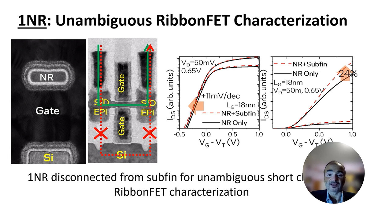 論文では実際に1NR(NR:Nano Ribbon)、つまりフィンが1枚だけのRibbon FETを構築し、その特性を測定したとしている。