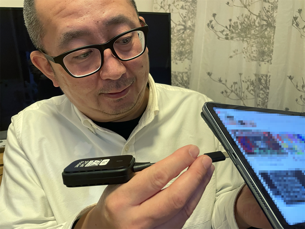 せっかくなので、2台目の送信機を接続してみよう。受信機が稼働している状態で、1台目の送信機の「ミラー/ペア」ボタンを押して投影をオフにする。2台目の送信機としてUSB Type-C接続タイプをiPadに接続し、電源をオンにする。なお、USB Type-Cタイプは外部給電不要なので接続するだけで電源はオンになる。