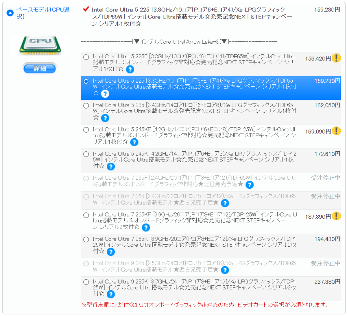 原稿執筆時点(2025年1月8日)で選べる65W&35W版Core Ultra 200Sシリーズは、10コアのCore Ultra 5 225とCore Ultra 5 225F、14コアのCore Ultra 5 235の3種類。20コアのCore Ultra 7 265とCore Ultra 7 265F、24コアのCore Ultra 9 285は「近日発売予定」となっていました。なお、35W版となるCore Ultra 5 245T、Core Ultra 7 265T、Core Ultra 9 285Tも対応PCで順次追加される見込みです