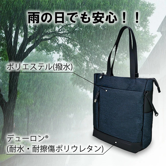 大容量かつ軽量、撥水性を備えたこのトートバッグは、A4ファイルや13インチのPCを収納可能で、通勤からアウトドアまで幅広く対応します。モノがサッと取り出せる構造を特徴としており、本体の両サイドにはペットボトルホルダーも完備しています。