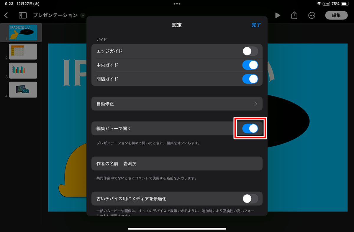 「Keynote」では、プレゼンテーションを最初に開いたときは表示モードのため、すぐには編集作業に取り掛かれない。これは誤操作によるトラブルを防ぐためだが、作業を始めるときにひと手間かかるのは面倒だ。もし、すぐに編集を始めたい場合は、プレゼンテーションを開いたら編集モードで表示されるように設定を変更しておこう。