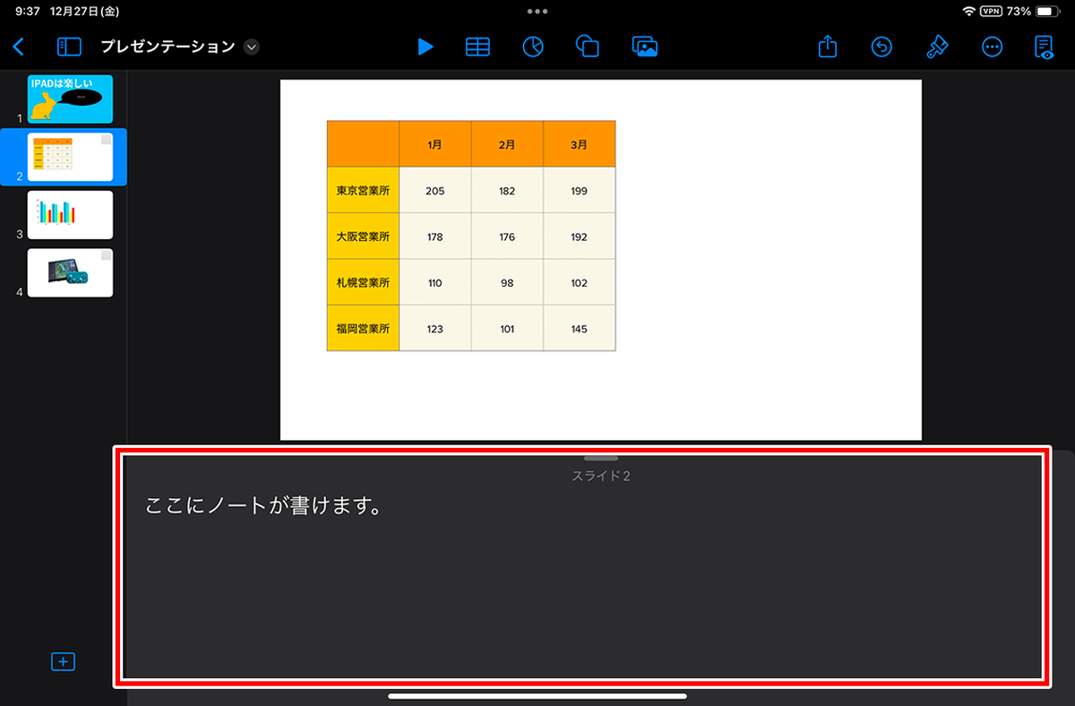 スライドごとにノートを作成できるので、そのスライドのポイントをまとめておけば、プレゼン中に確認しながら進められる。発表者ノートを開くとスライドの編集領域が狭くなるため、必要なときにだけ表示するようにするとプレゼン作成がスムーズになる。