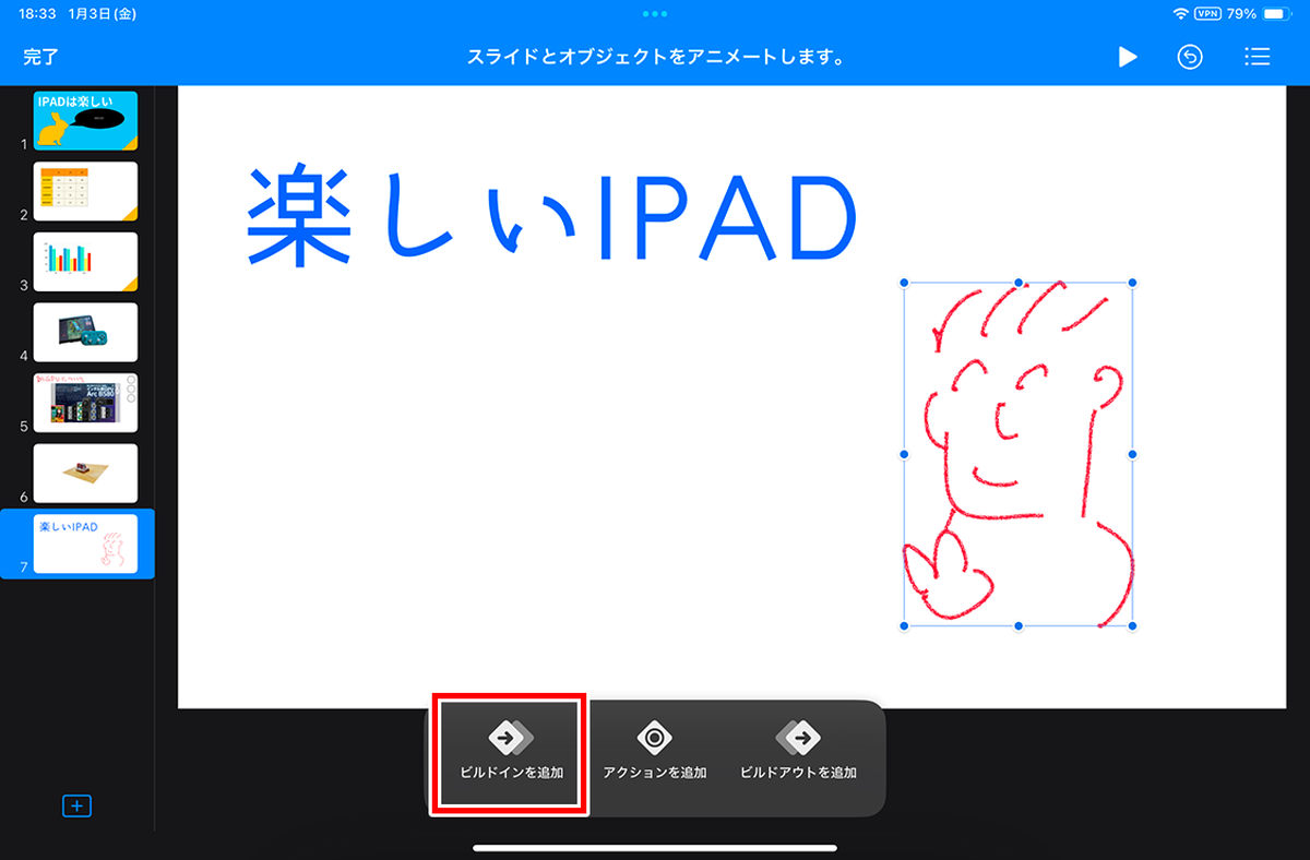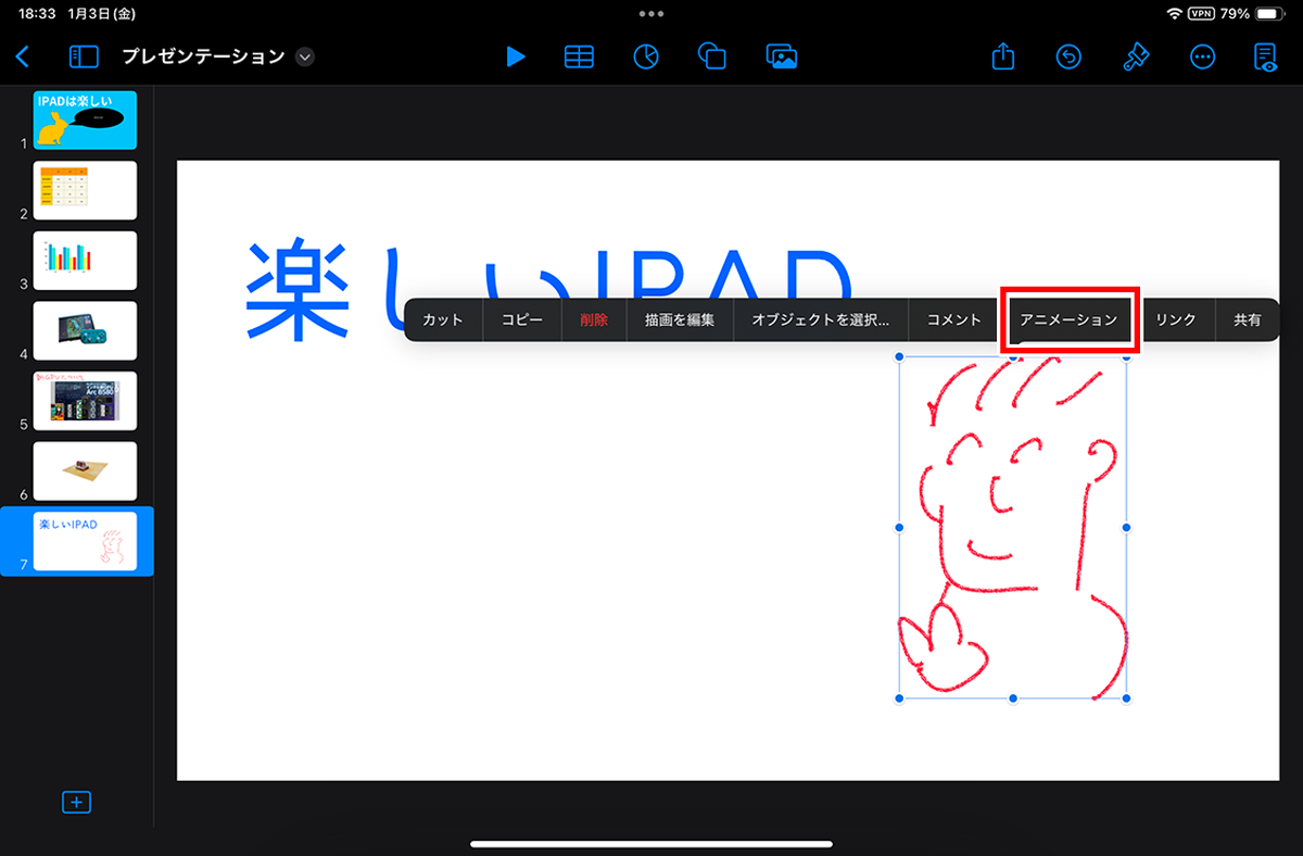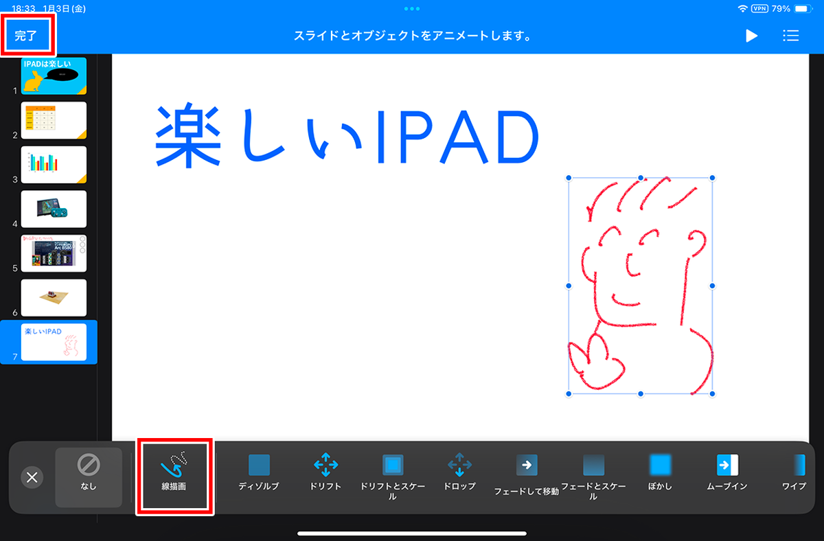 iPadならではのユニークな使い方は、手書きしたイラストを描いていくように見せられる効果だ。自分が描いたとおりに再現してアニメにするので、見ていて非常に楽しい。このようなアニメを目玉となる部分で挿入しておくと、雰囲気のあるものに仕上げられるだろう。
